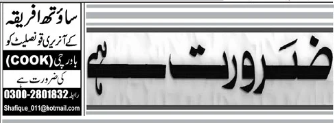 • ساؤتھ افریقہ کے آنریری کونسلیٹ کو باورچی کی ضرورت ہے رابطہ لئے اس نمبر پر رابطہ کریں ۔