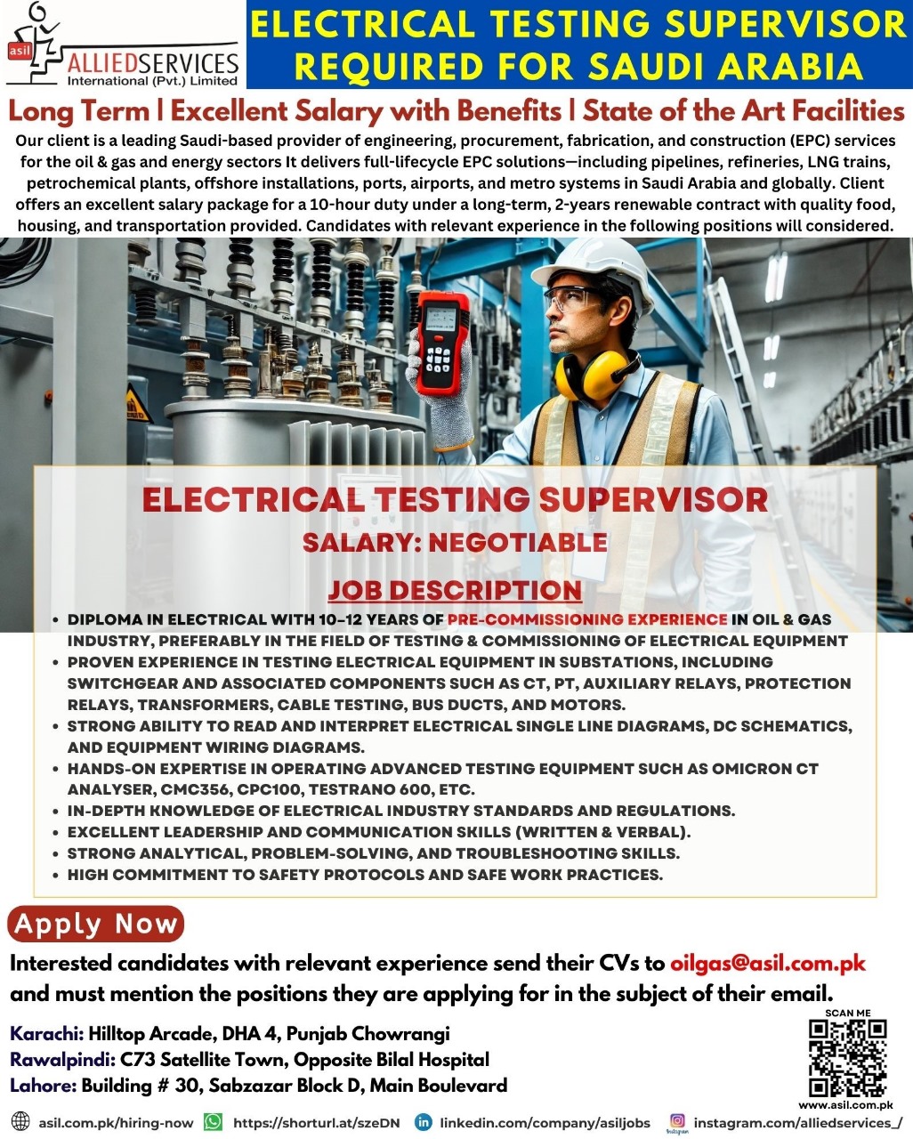 Allied Services International Lts is hiring Electrical Testing Supervisor for Saudi Arabia form Overall Pakistan. Duty 10 hours per day. 2 year work visa.
